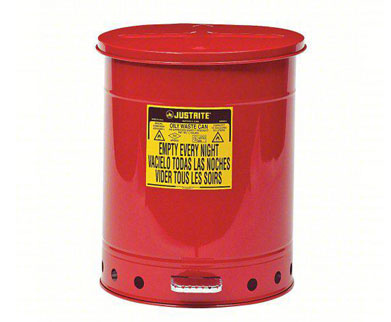 JUSTRITE Oily Waste Can: 14 gal Can Capacity, Galvanized Steel, Red, Foot Operated Self Closing